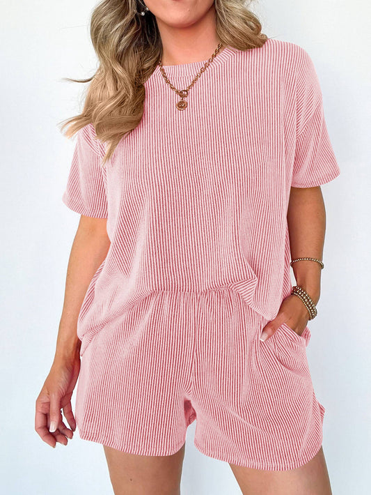 Wholesalesir - Striped Round Neck Top And Shorts Two-Piece Set