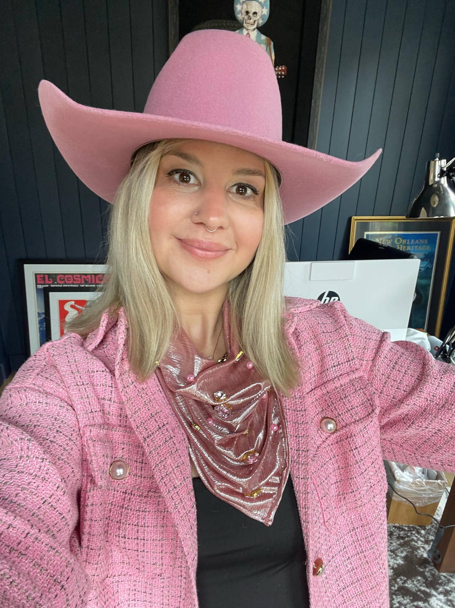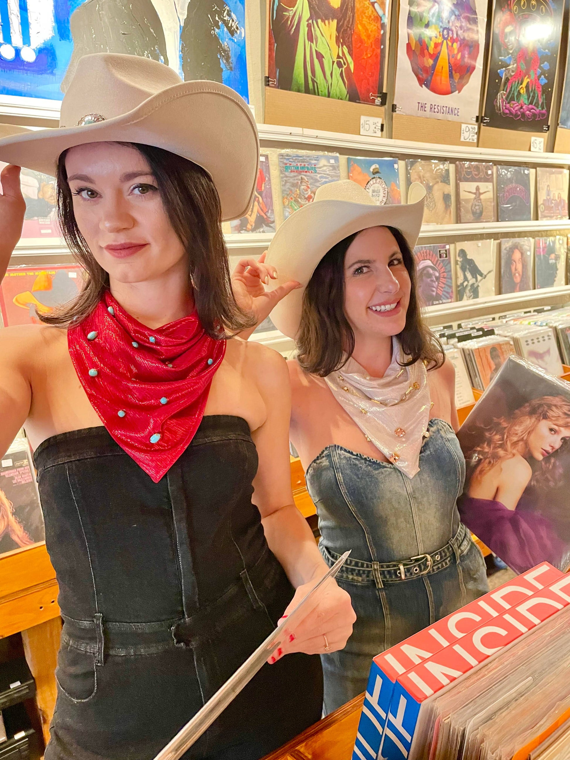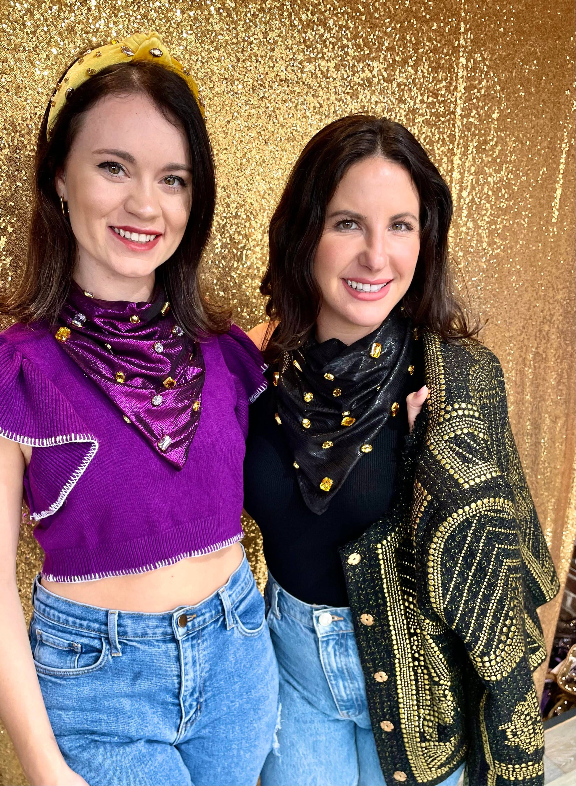 These one of kind bandanas are designed to replicate the junky jewels and pearls you see on the headbands these days! Bright colors, chunky jewels, pearls, and turquoise stones. They are each individually hand sewn on. Placed on fabric that has a slight shimmer when you wear. Polyester blend. 21x21in.