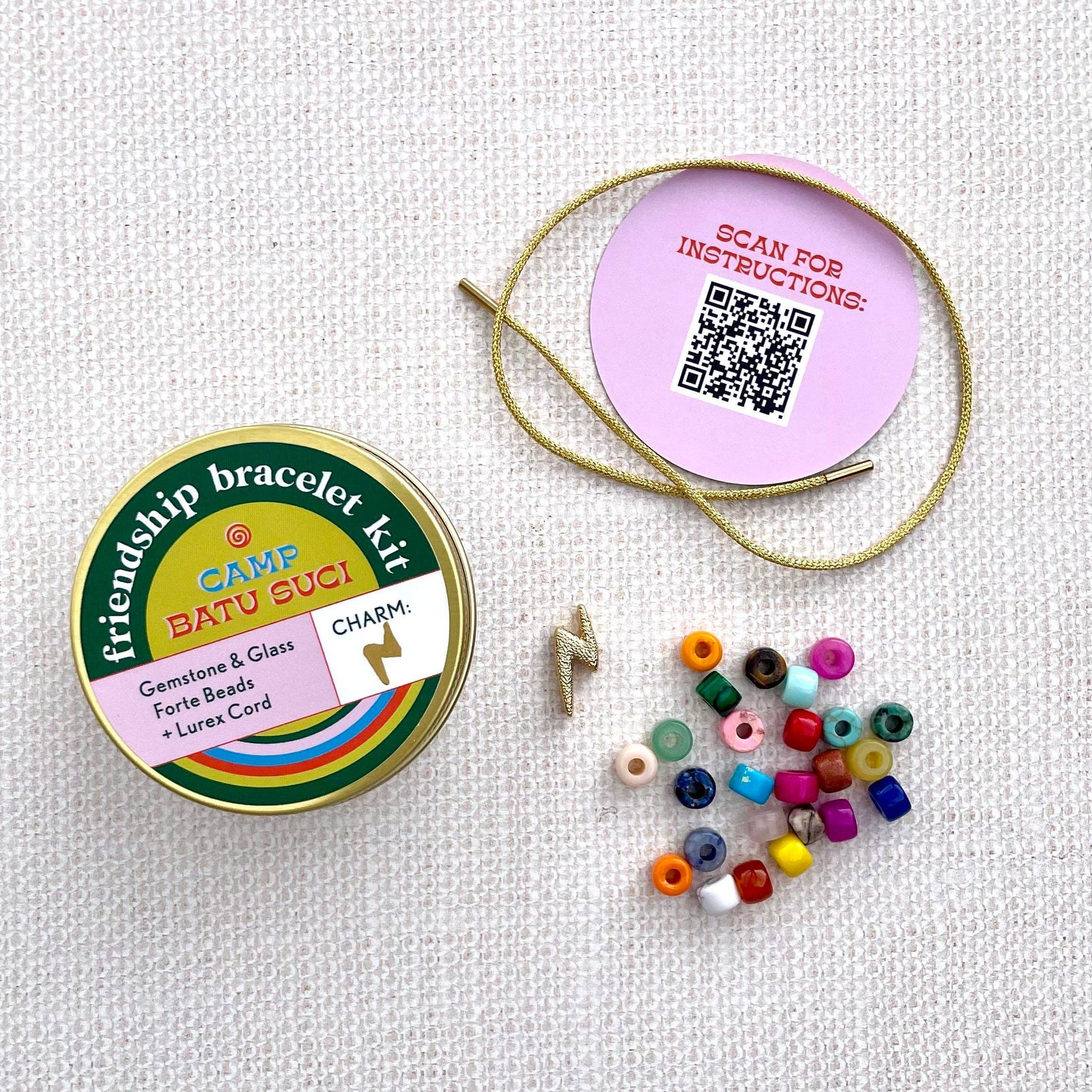Each kit comes with 24 high quality, assorted gemstone and glass Forte Beads and sumptuous Lurex cord. Plus, choose between a star, heart, or lightning bolt gold charm to add a touch of flair.
