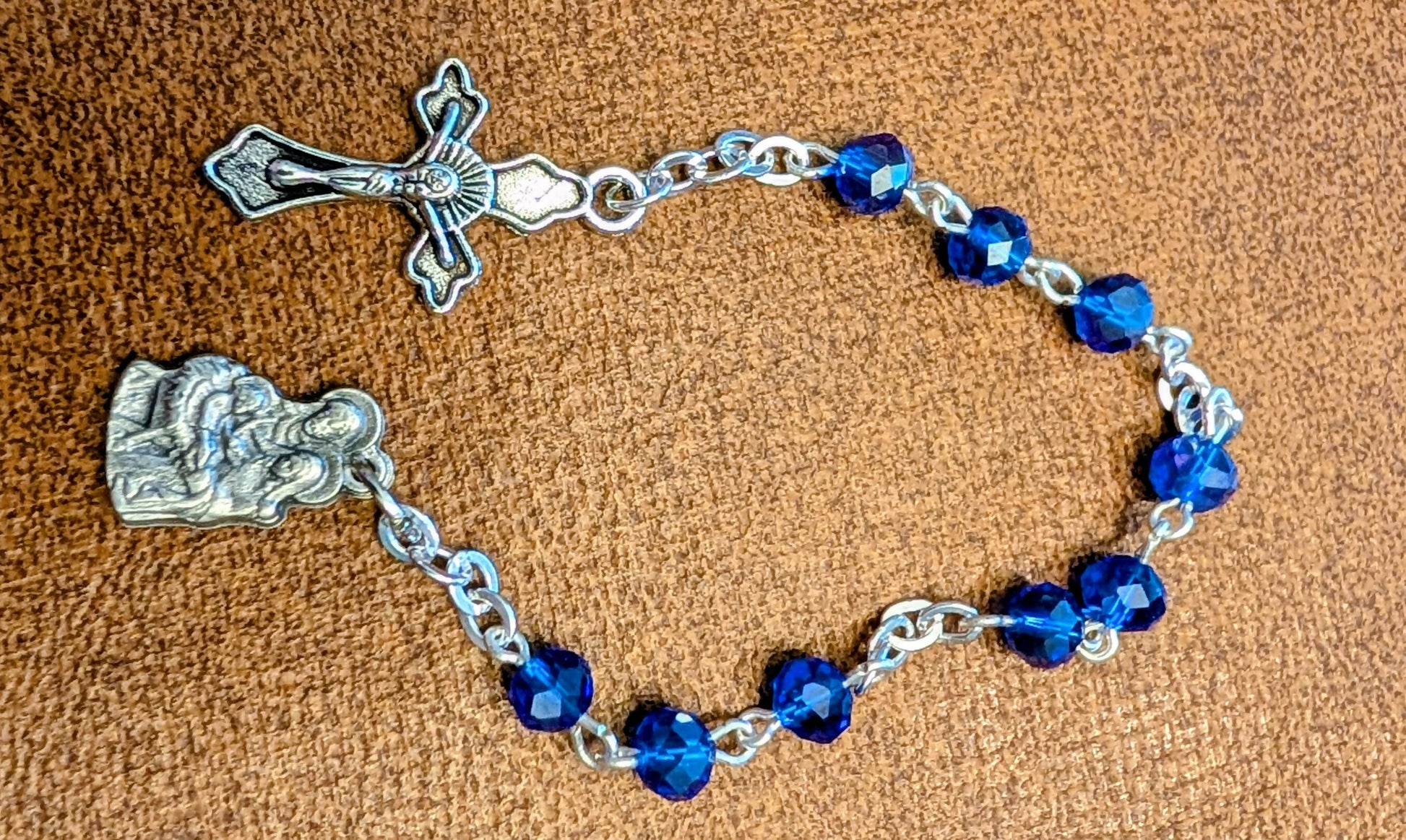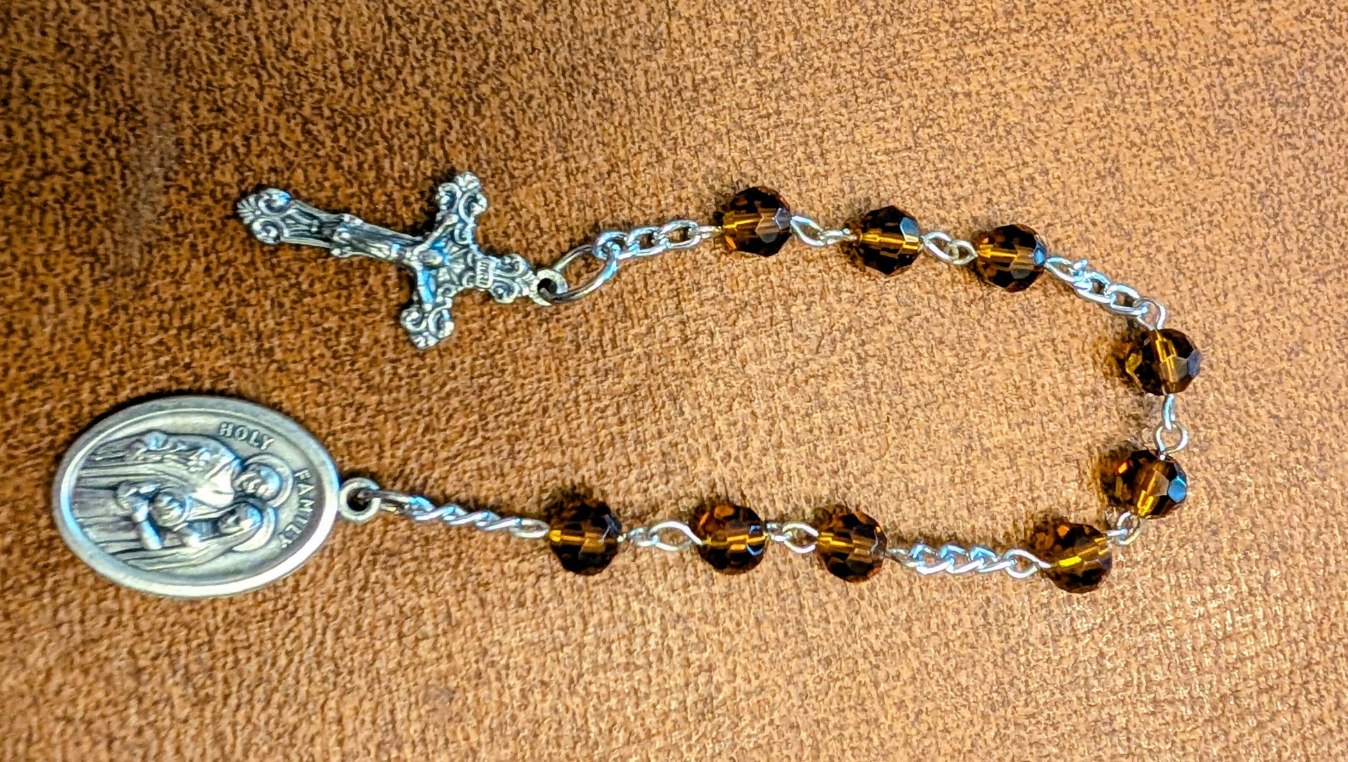 Crystal beads with metal crucifix and Holy Family medal