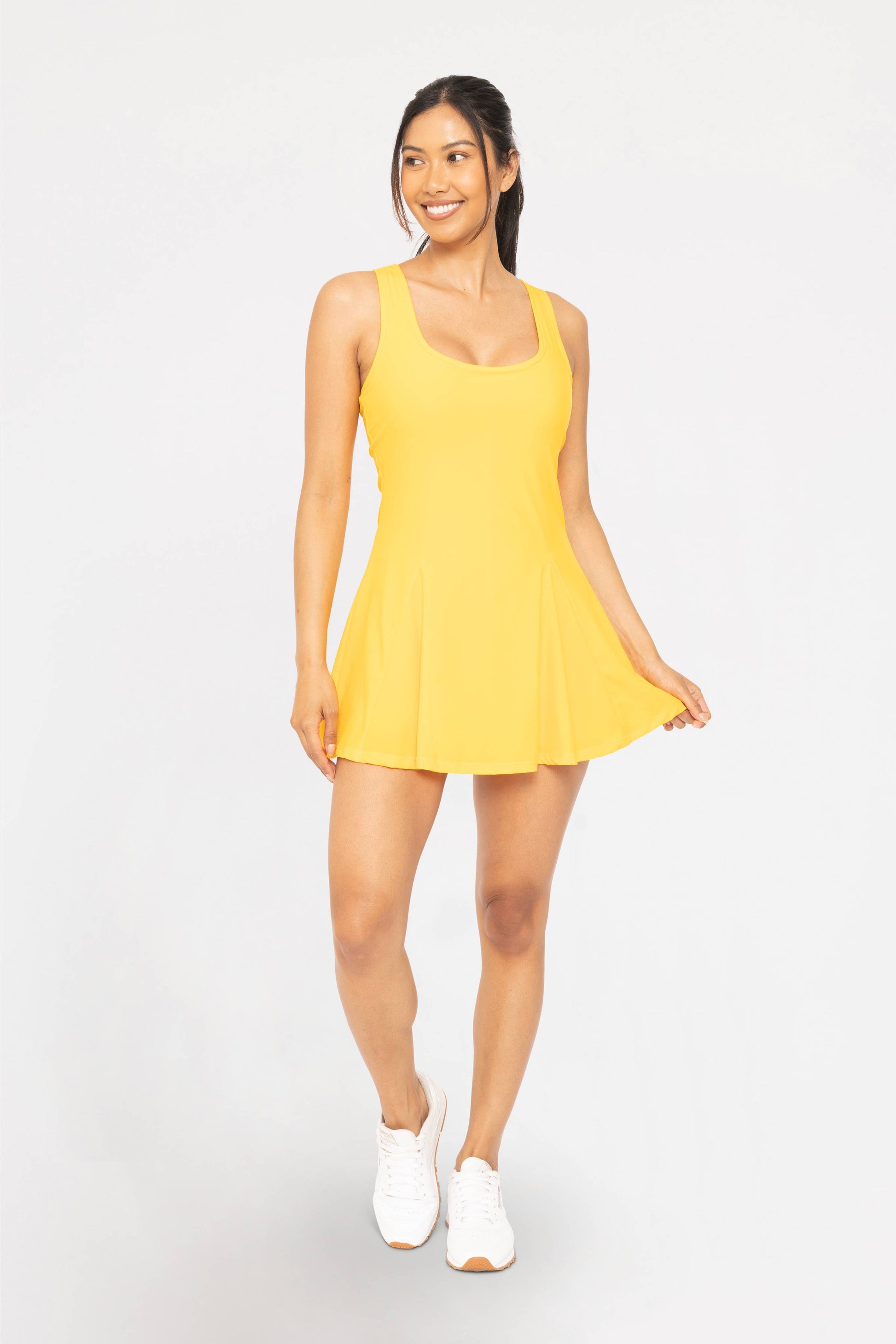 Square neckline A-line dress with criss-cross adjustable straps, built-in bra, and shorts for added support and coverage.