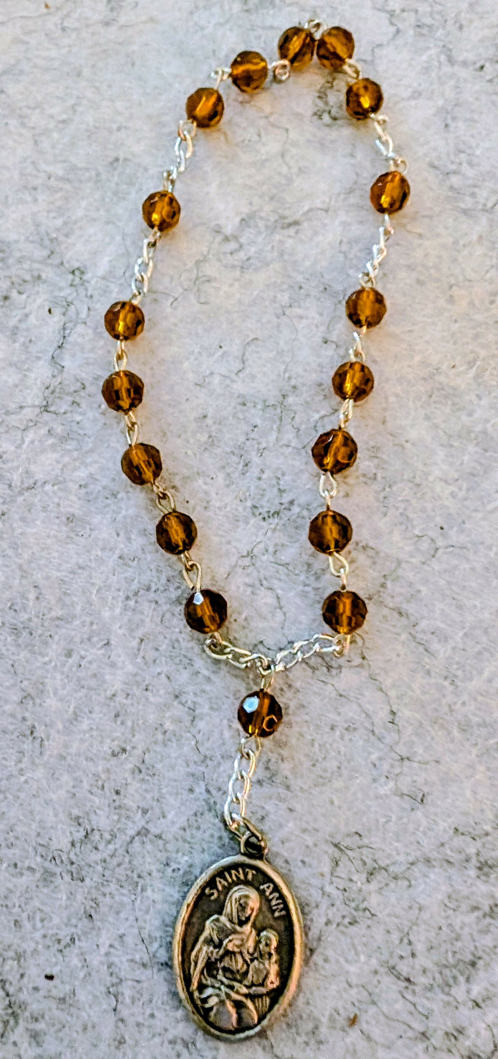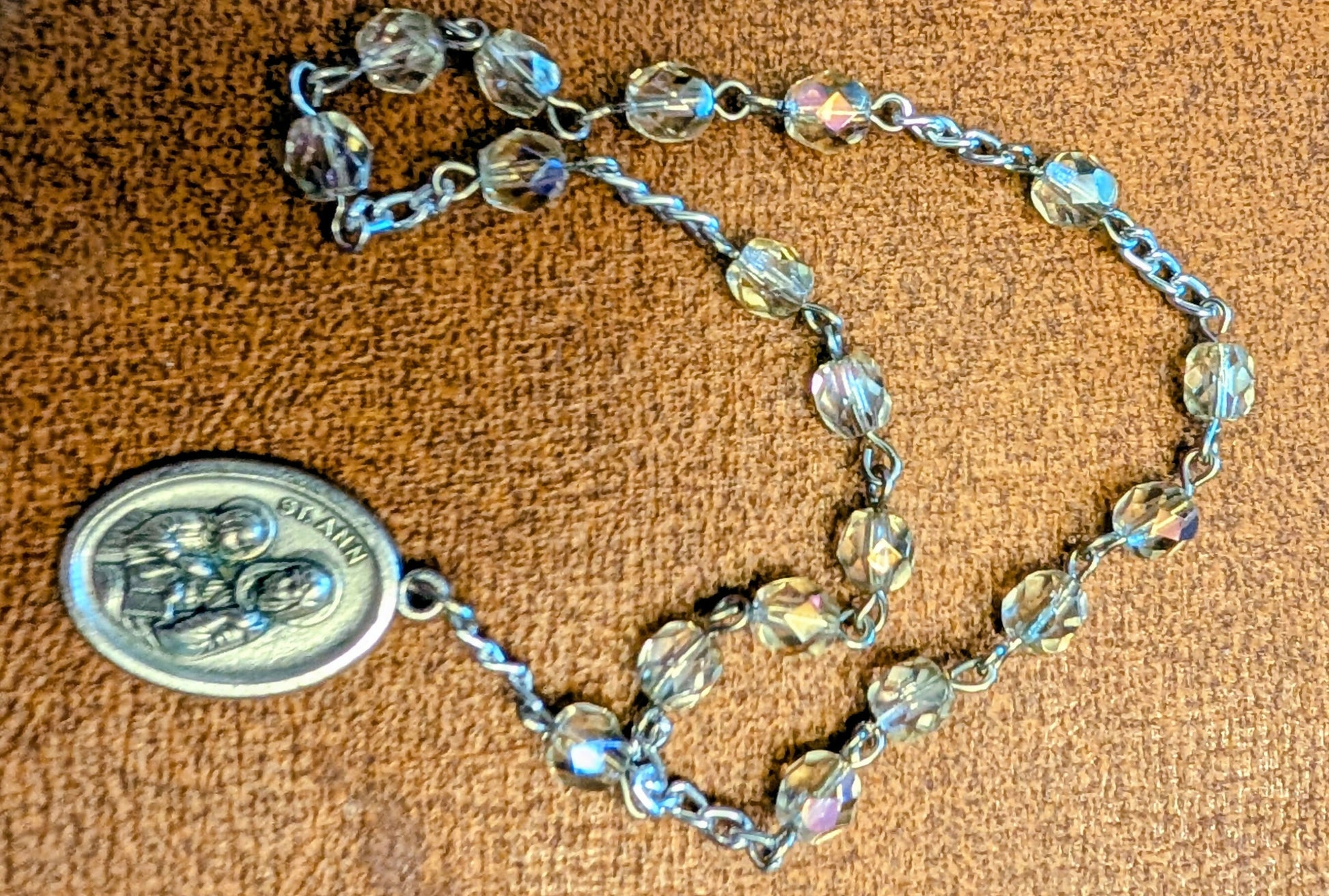 Smoky topaz colored crystal beads with a silver colored St Ann medal