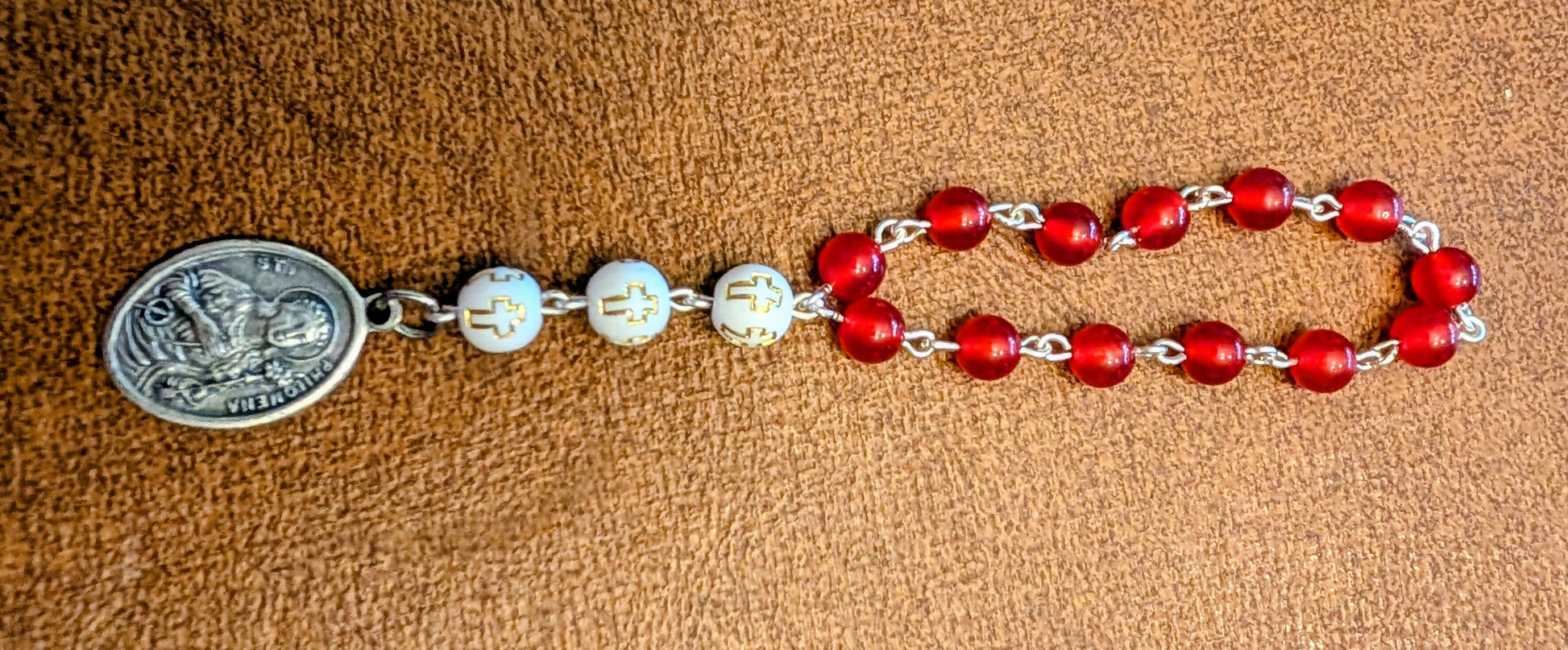 red glass beads with white beads with gold crosses on them and metal St Philomena medal