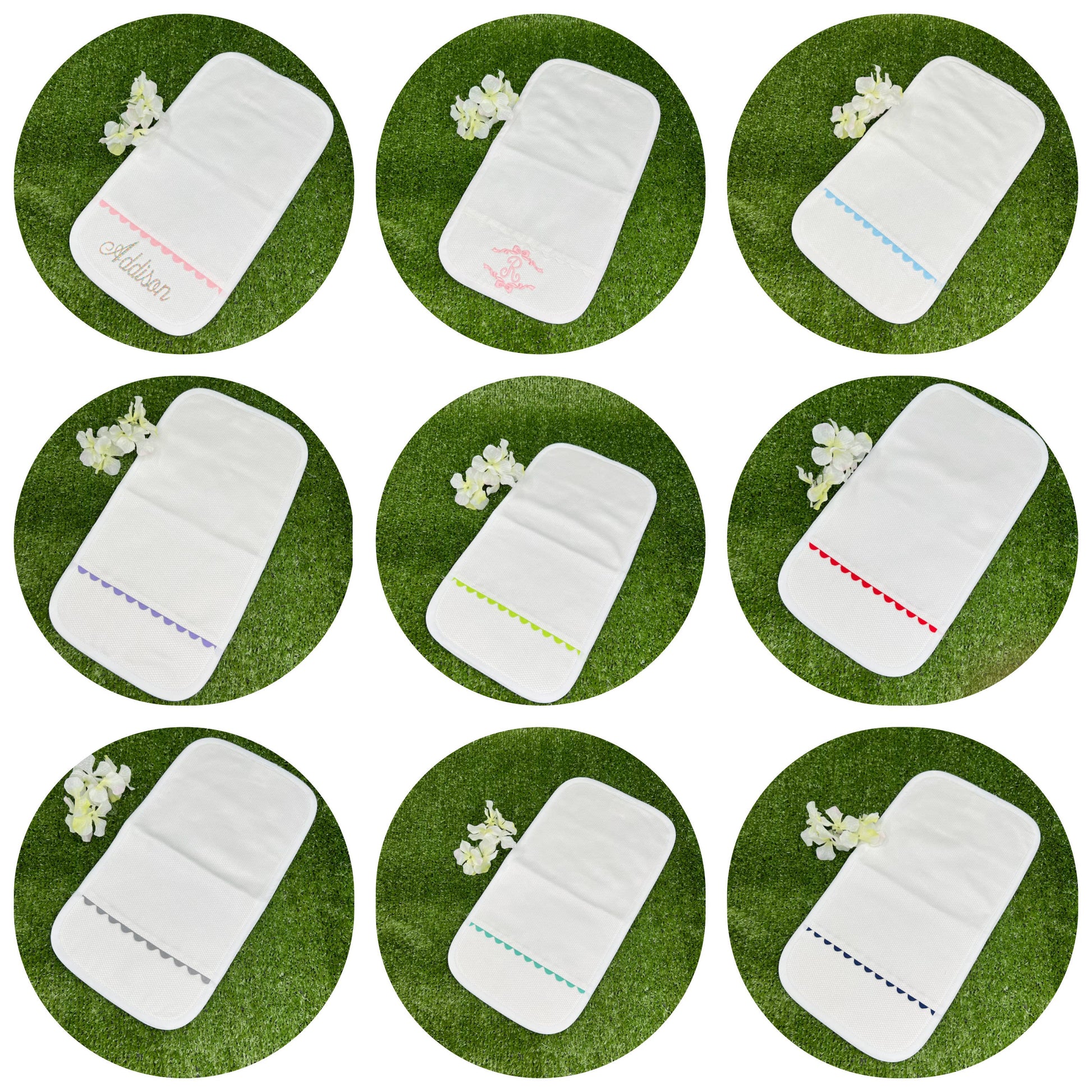 100% cotton pique burp cloth is approximately 9.5 x 16 inches lined in a soft, satin feel, waterproof fabric.