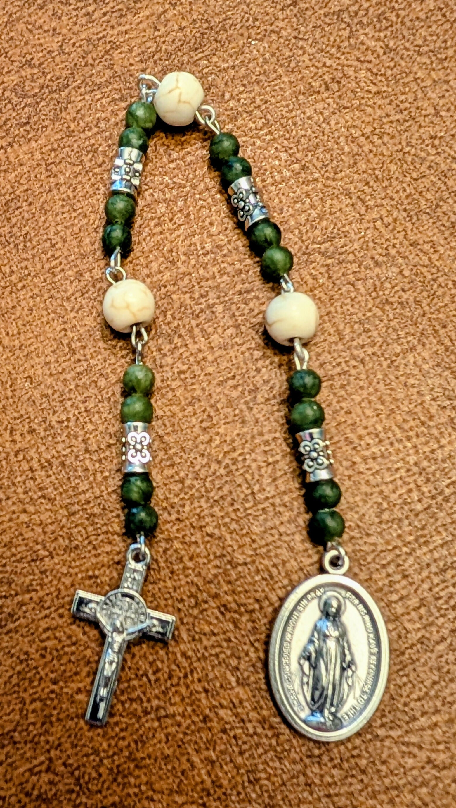 Natural stone and metal beads with a silver colored Mary and crucifix or